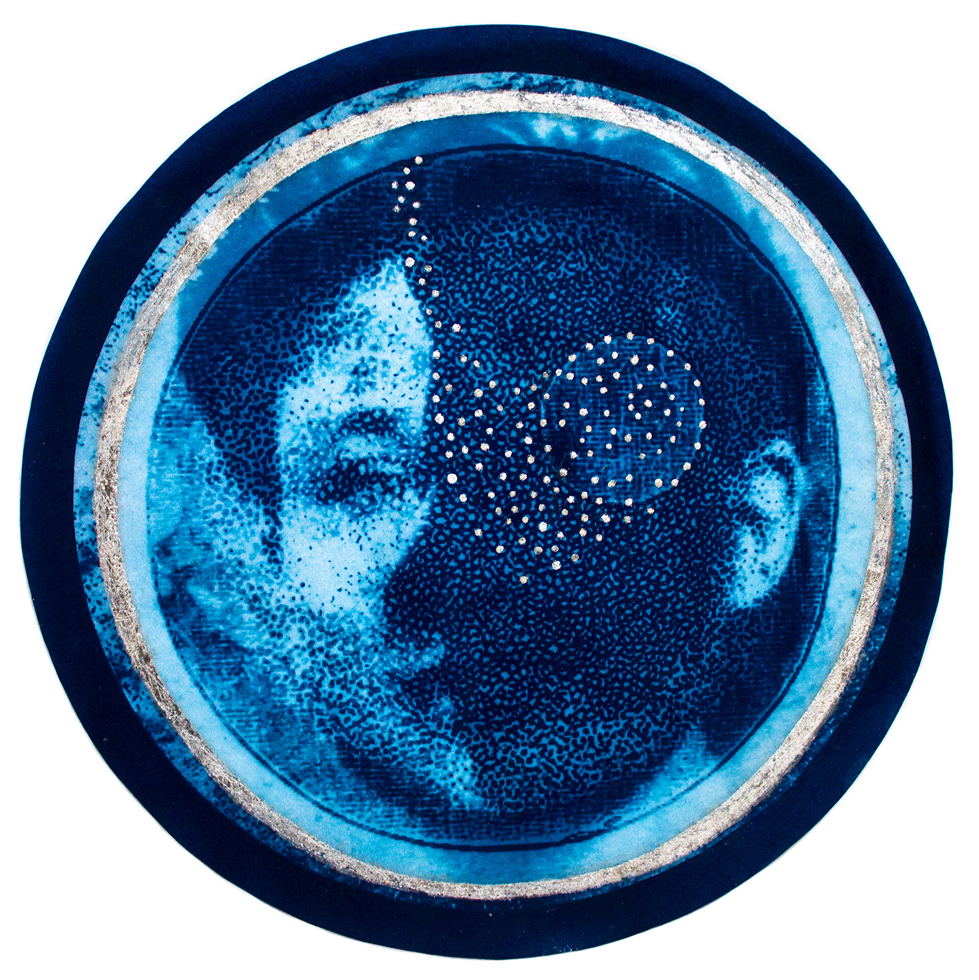 I created this series by digitally merging my mother’s image with a shadow image of myself. I layered these images with a 19th century illustration of a human ovum and an image of a galaxy taken with the Hubble space telescope. After making a cyanotype, I added silver leafing to each finished piece to emphasize the preciousness of life. Each of the 6 pieces sequentially morph from portrait to galaxy, the physical body joining with a larger eternal story. The micro and macro mirror each other while the finite dissolves into infinity.
